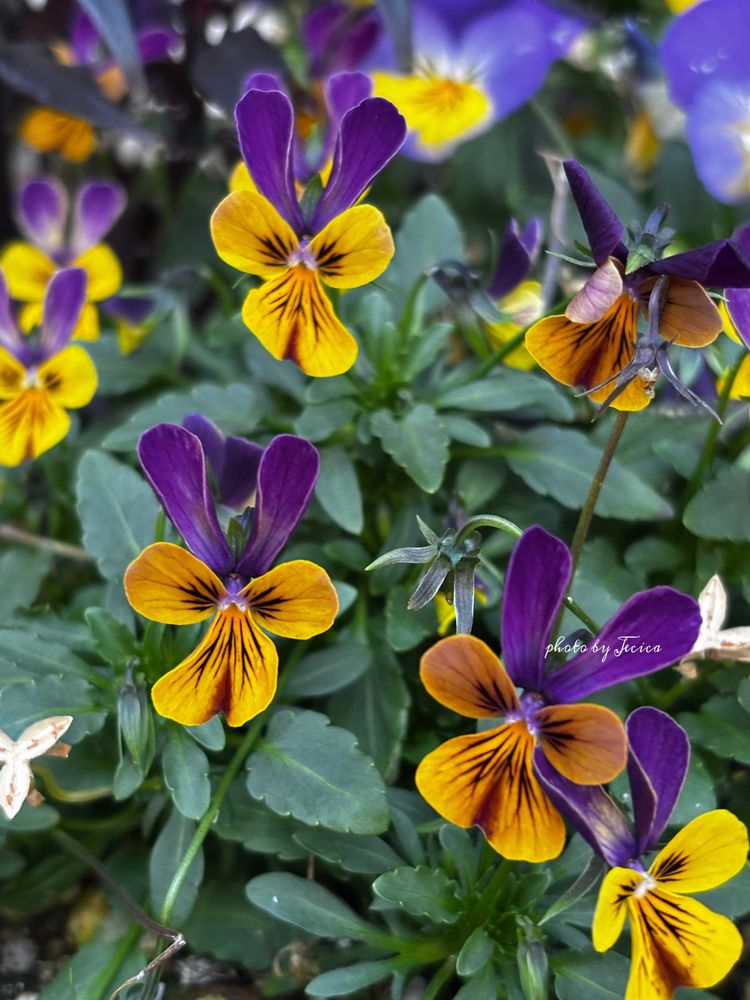 寄せ植えの中のビオラが可愛く風に揺れながら咲いています