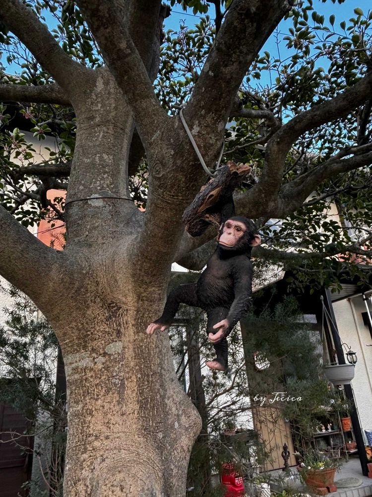 5枚目 庭の大きなクロガネモチの枝にぶる下がってるチンパンジー