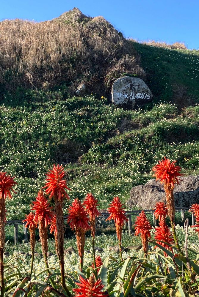 今年は難しそうですが、爪木崎の水仙まつり、忘れないようクリップ📎しておきます!青い空と海と、水仙の白とアロエの赤‥ 素敵でしょうね。見てみたいです✨