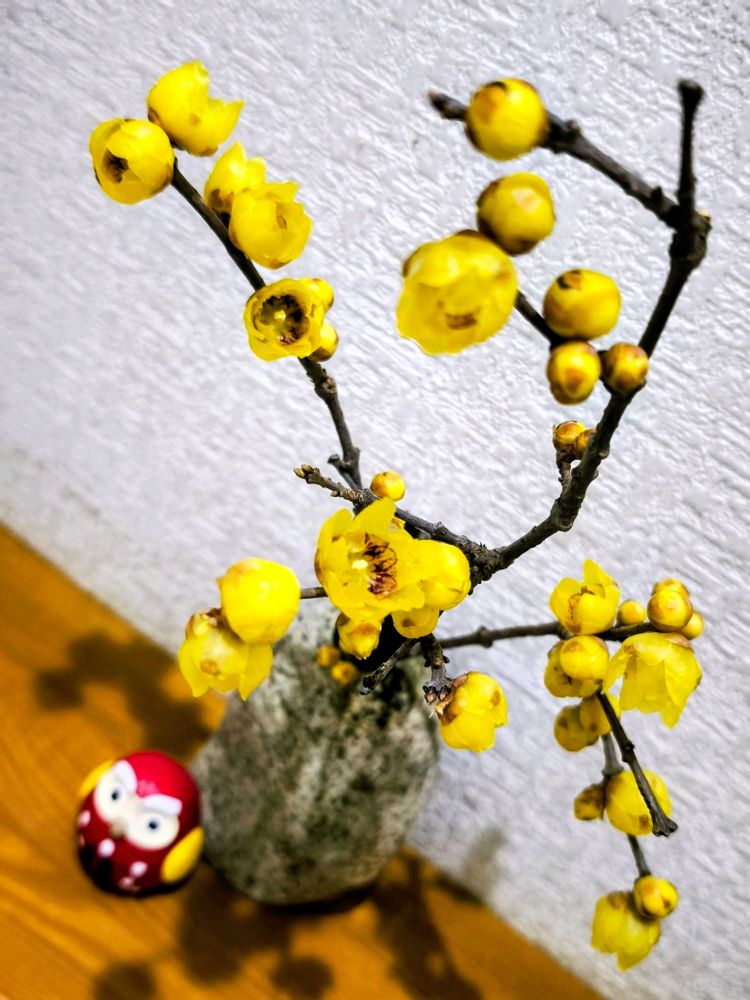 成人の日に家の近くの農家さんで日本水仙とともに実家の父にプレゼントしようと枝物のロウバイを購入、その際にほんの少しだけ蕾ばかりの枝をハサミで切って自分用に残しておきました😉