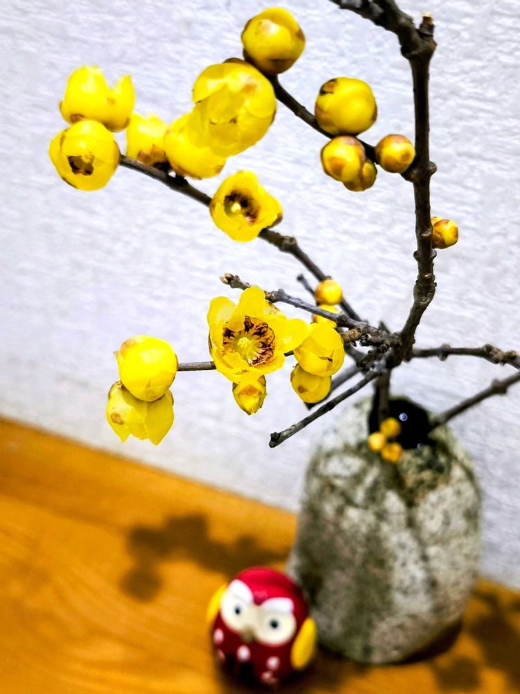 黄色の蝋梅と石の花瓶🏺、とっても和テイストでマッチしてますね。ワクワクが伝わって来ます♪わ😊