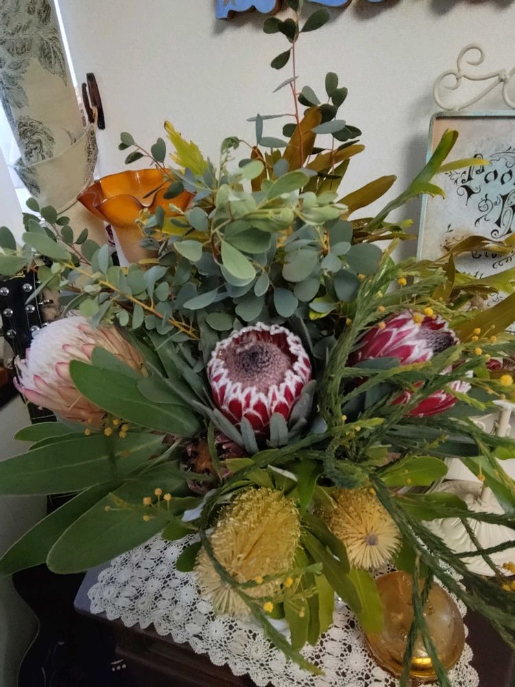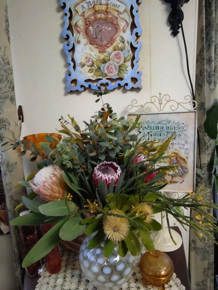 本当は、スワッグにしたかったんだけど、プロテアの蜜がしたたりそうで、とりあえず花瓶に入れてみました〜🤭💚✨