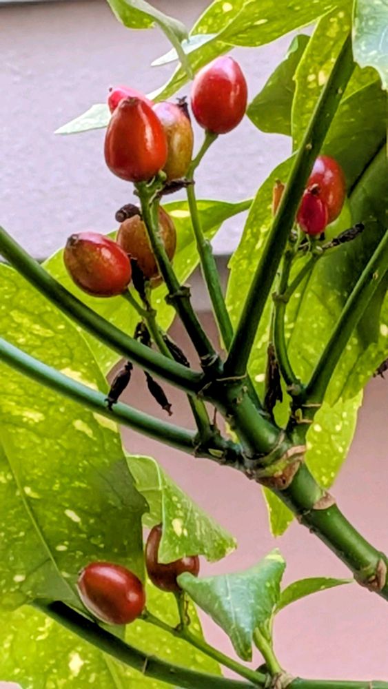 ①我が家のアオキの実が前より赤く色づいてきてます。