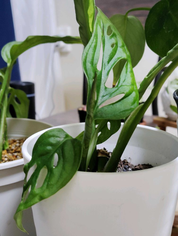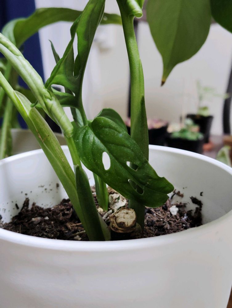ポキっとした株は根元ギリギリの気根近くでヒビが入り、無理無理カットして頑張って生えて来てくれましたがしばらく育てて順調だったのに、なんか弱々しく変な葉も生えて来てしまったので挿し芽用にカット。1枚目2枚目は親株で、また頑張って新芽出してくれてます。小さい葉が可愛い❤