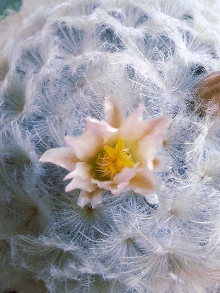 ふわふわの綿毛の中からサーモンピンクの花🌸が⤴️かわいい😍ネ〜