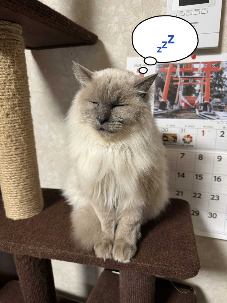 2枚目・ふと見たらキャットタワーで座ったまま寝てるしろちゃんでした🙀