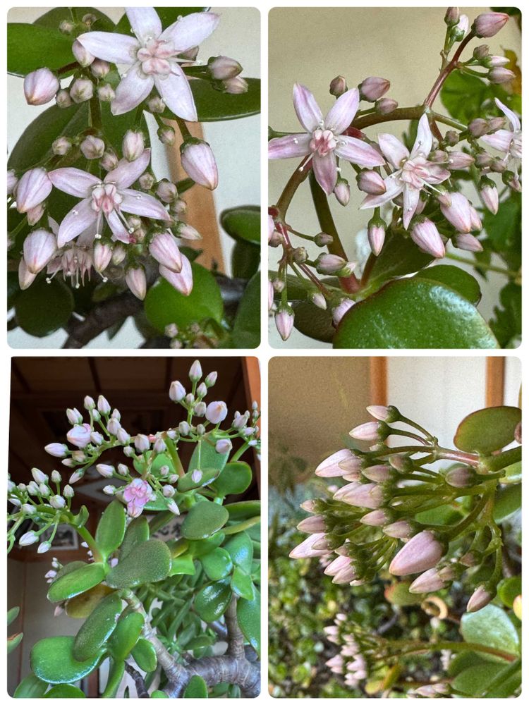 4枚目・我が家の縁側に避難している金のなる木です。可愛いピンク🩷の花が咲き出しました😍