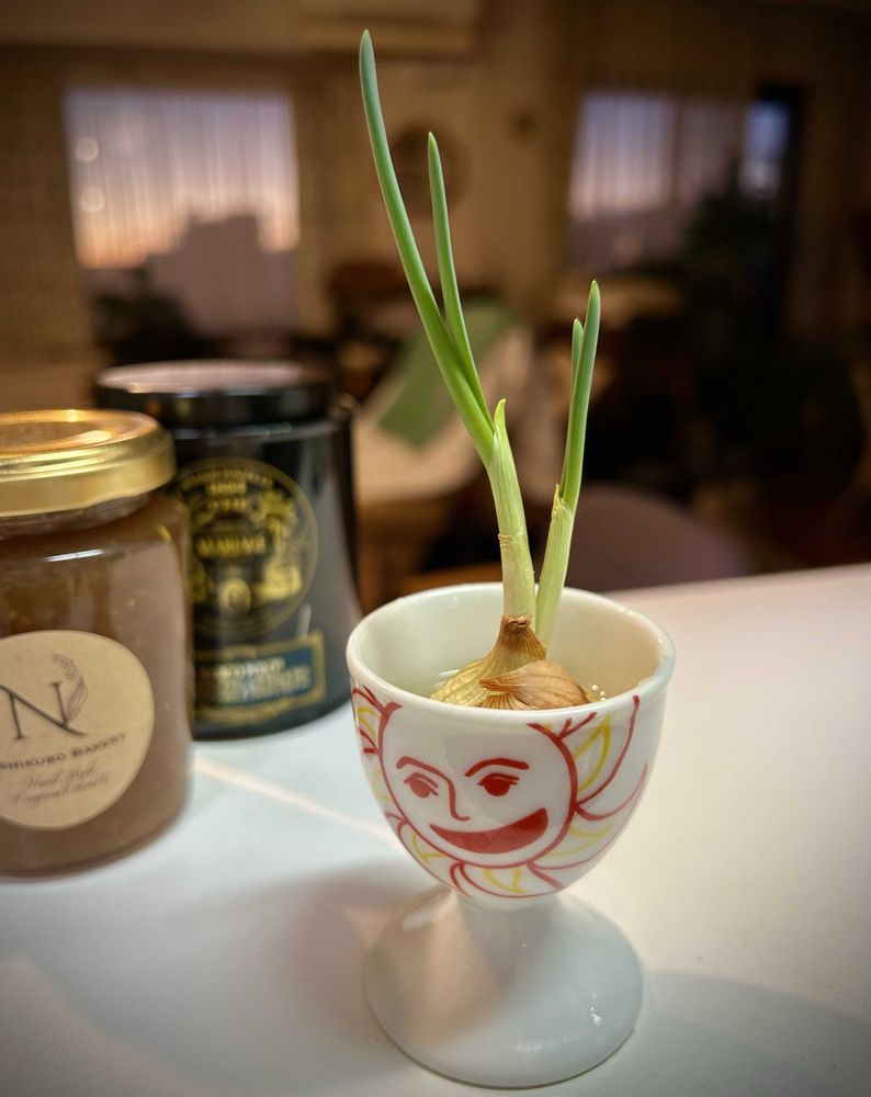キッチンのカウンターでひとつ残って芽が出たペコロスをエッグスタンドで水耕栽培(⁎⁍̴̛ᴗ⁍̴̛⁎)