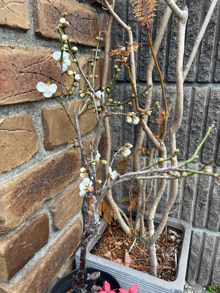 2枚目 ウメ 手前ちちょこっと見える赤いのはオタフクナンテン、奥はジャカランダ