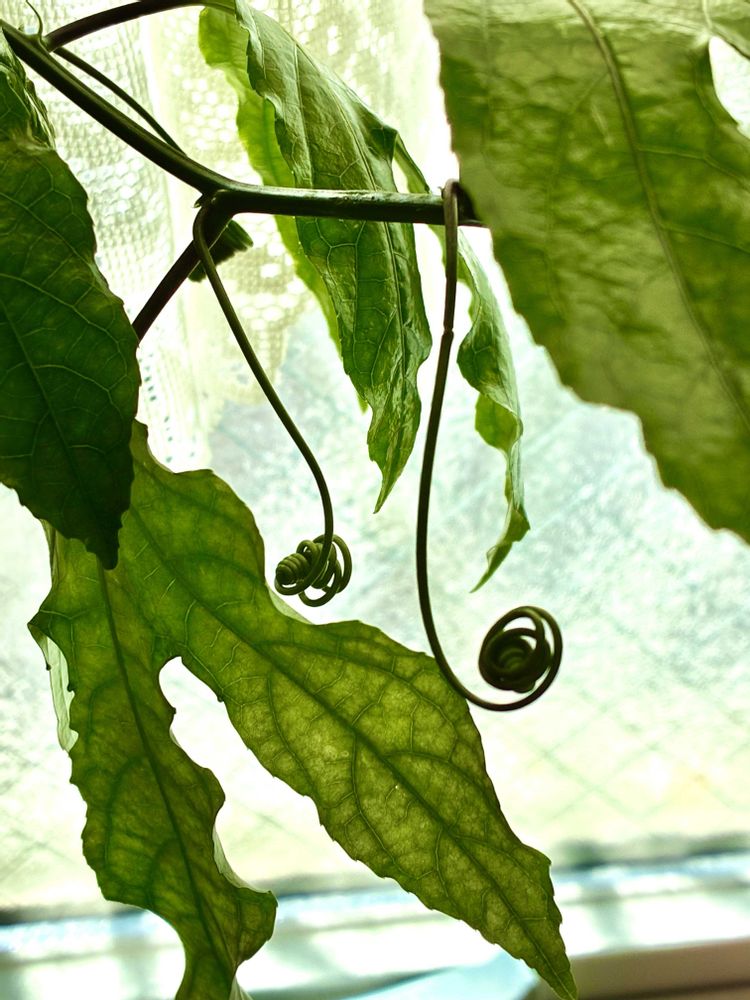 お部屋に取り込んだパッションフルーツは絡まるところがないのにどんどんどんどん伸びています