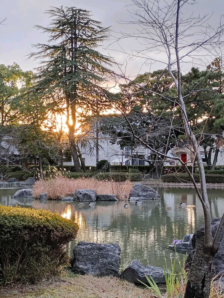 池の縁に立ち止まると、カモたちが、一斉に、どこからともなく寄ってきました😄♪