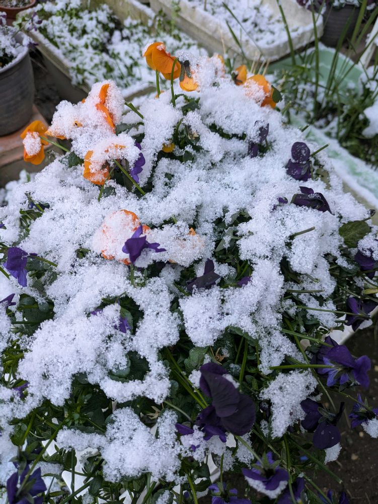 今朝も雪が積もっていました。ルピナスだけは、不織布をかけておきました。