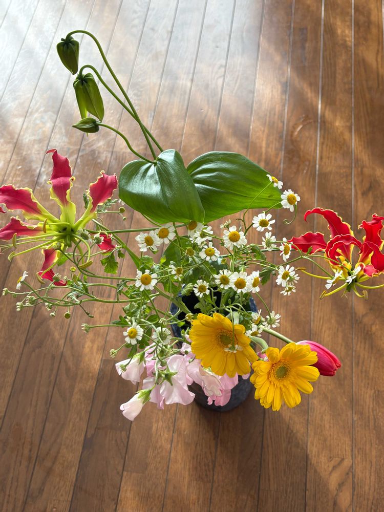 今日の生け花、グロリオサ大好きな花です、ガーベラ,スイートピー,チューリップ🌷春らしい生け花ですね😁素敵😄