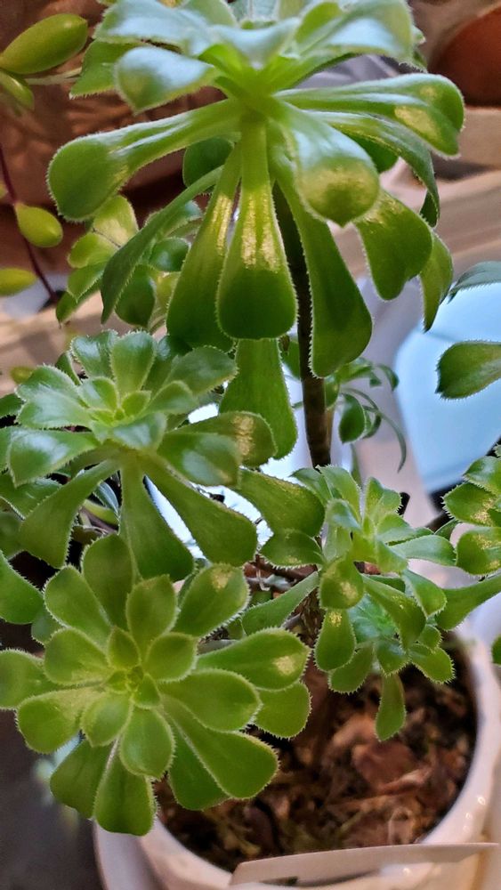 雪のため植物たちは、家の中に避難してますが、ひょろひょろした新芽がのびのび……お日さまのひかりが足りませんね😓