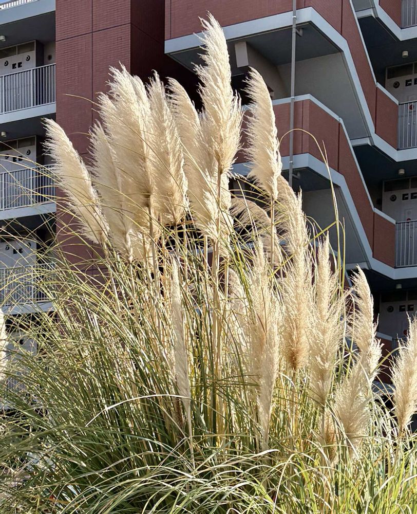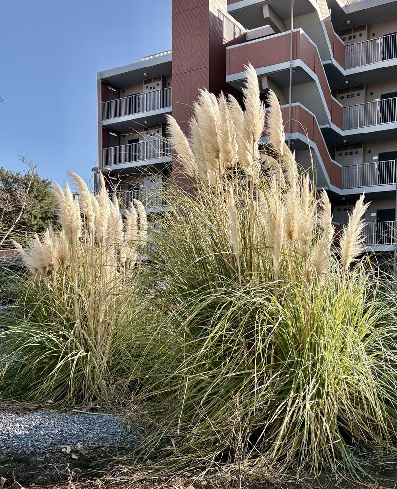 普段あまり使わない道路。移動中にドライフラワーとしてよく使われる『 パンパスグラス 』(※別名-西洋ススキ )。団地敷地内にとても大きく大きく育ち、風に揺られ咲いて?いました。