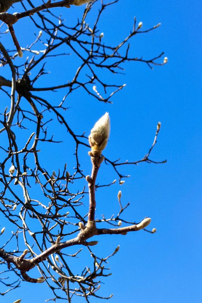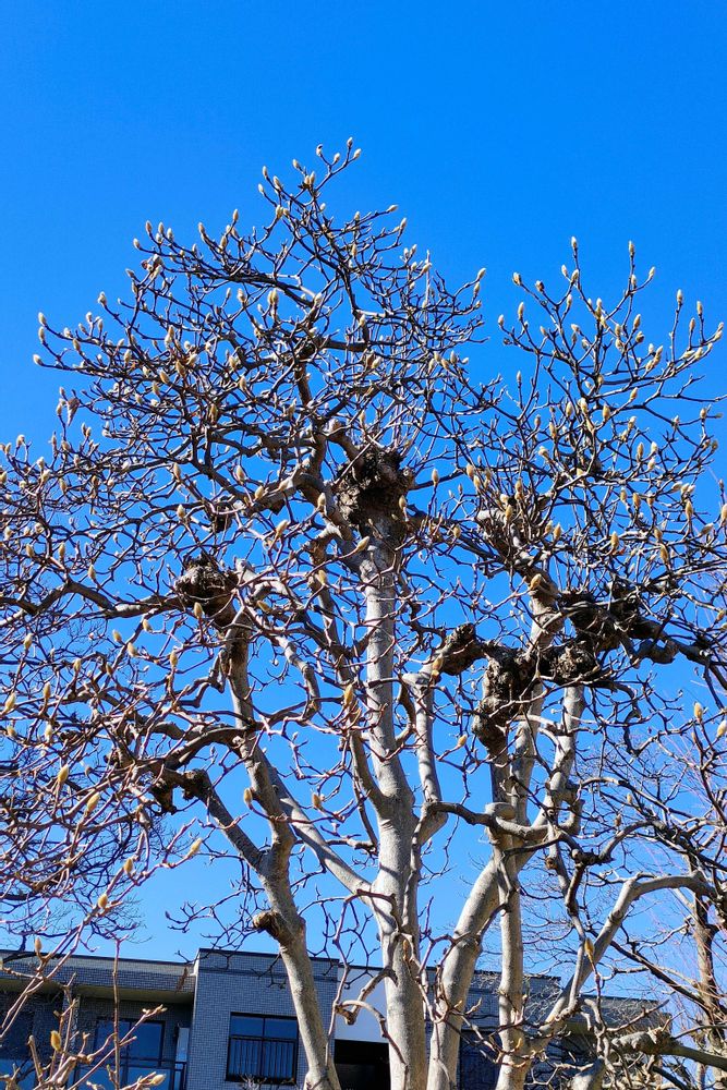 ②無数の枝枝と掲げた蕾が空に織りなすシルエット。