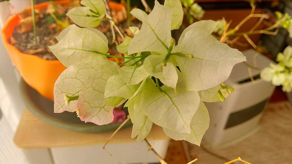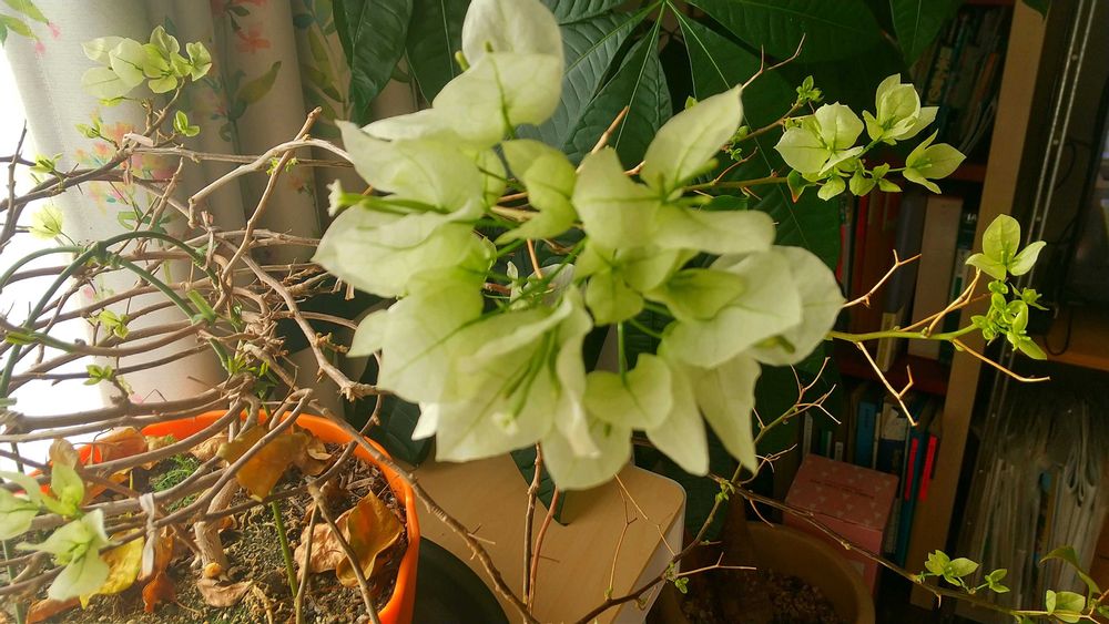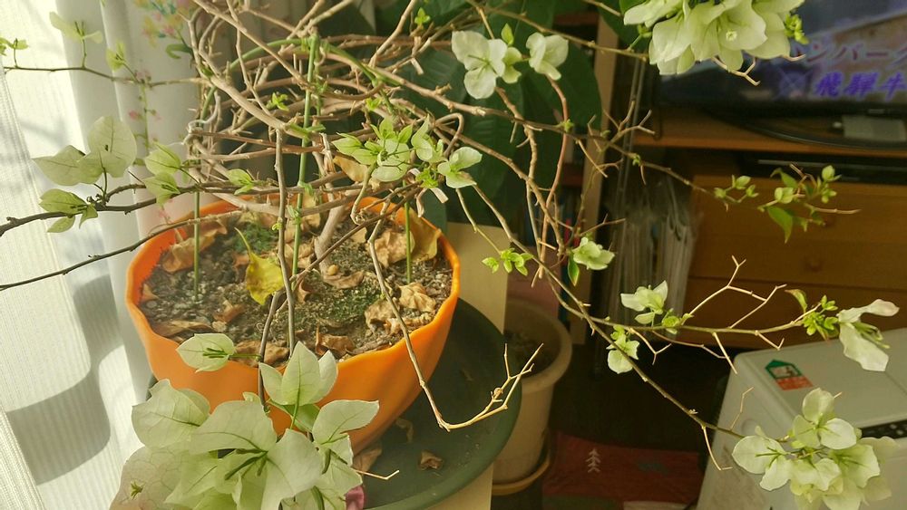 厳冬期に居間に避難してあるブーゲンビリアに花が咲き出しました。葉はすっかり落葉しましたが、花が一杯付いて開き出した。まだ白いですが、これからゆっくりピンク色に変わって来ます。🌸🤗🥳