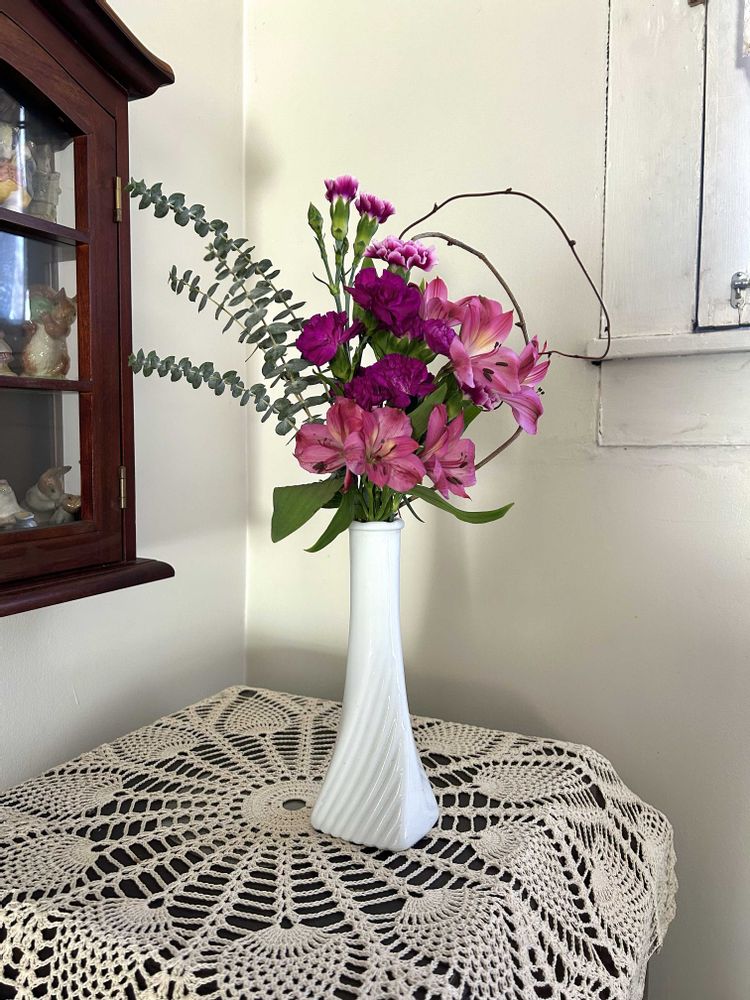 ミルクガラスの花器にピンクのお花達が一段と可愛く見えます。