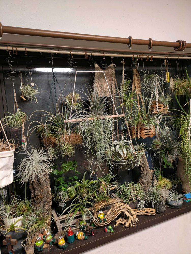 リビングのインテリアとして、狭い出窓辺緑化はチランジア最適なんてしながら育てられています。原酒が好きです。(原種)しかーし、自然交配種はいたりします。106株、チランジア100種、その他鉢植え6種です。(20240926) リビングで自然光と風(サーキュレーター)でやっています。