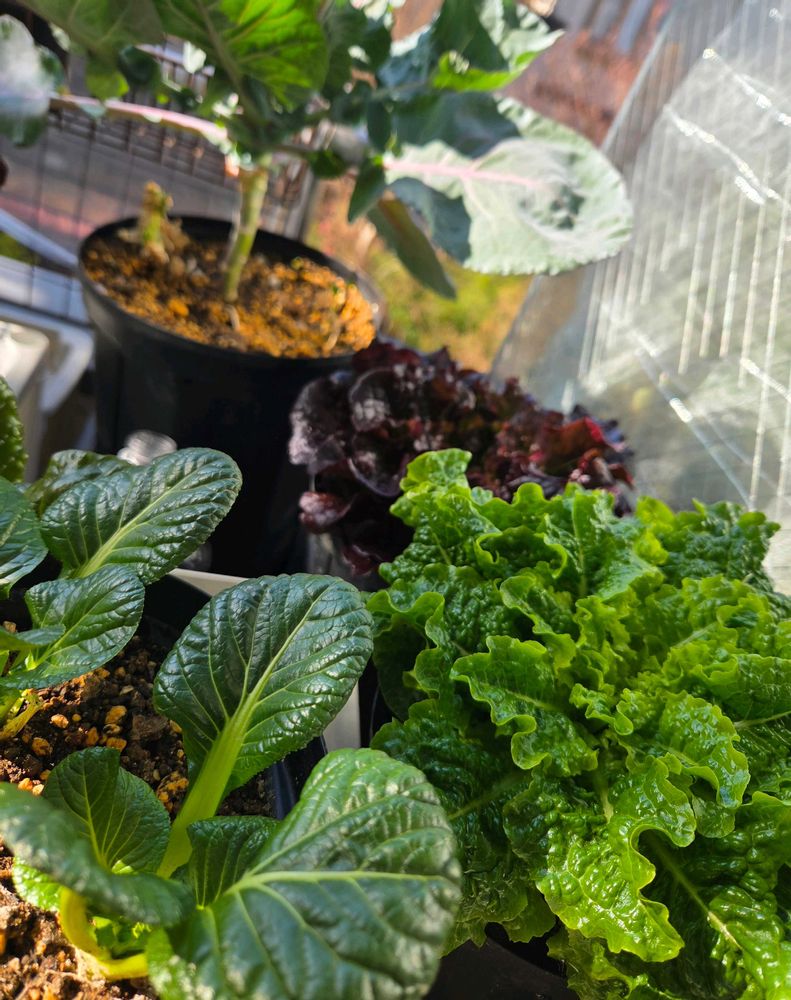 ①リボベジ、小松菜、サンチェ、サニーレタス②リボベジ、フリルレタススーパーの根付野菜を差してみました。③今月7日の出窓。冬越しの様子