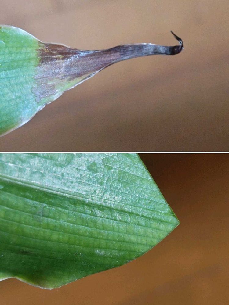 葉先にまた黒い部分が。これは病気ではなく、傷からに見えます。壁にあたったりした衝撃からか⁉️
