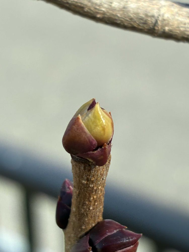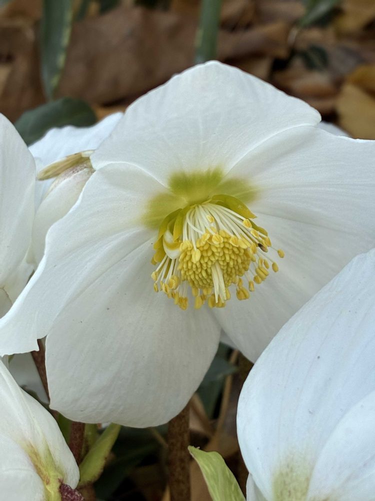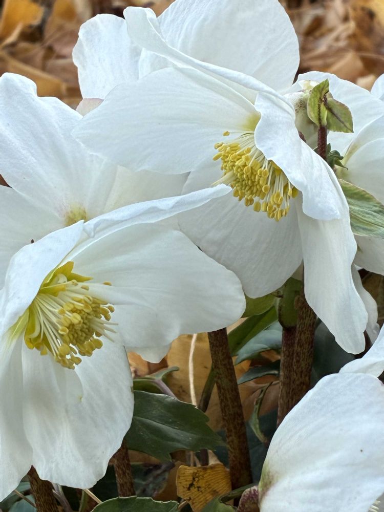 公園で咲いているクリスマスローズ。ライラックの冬芽、ロータスブリムストーンの新芽もパチリ。