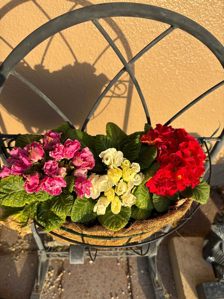 1️⃣軒下のバラ咲きジュリアン、ピンクが少し霜害を受けています😢