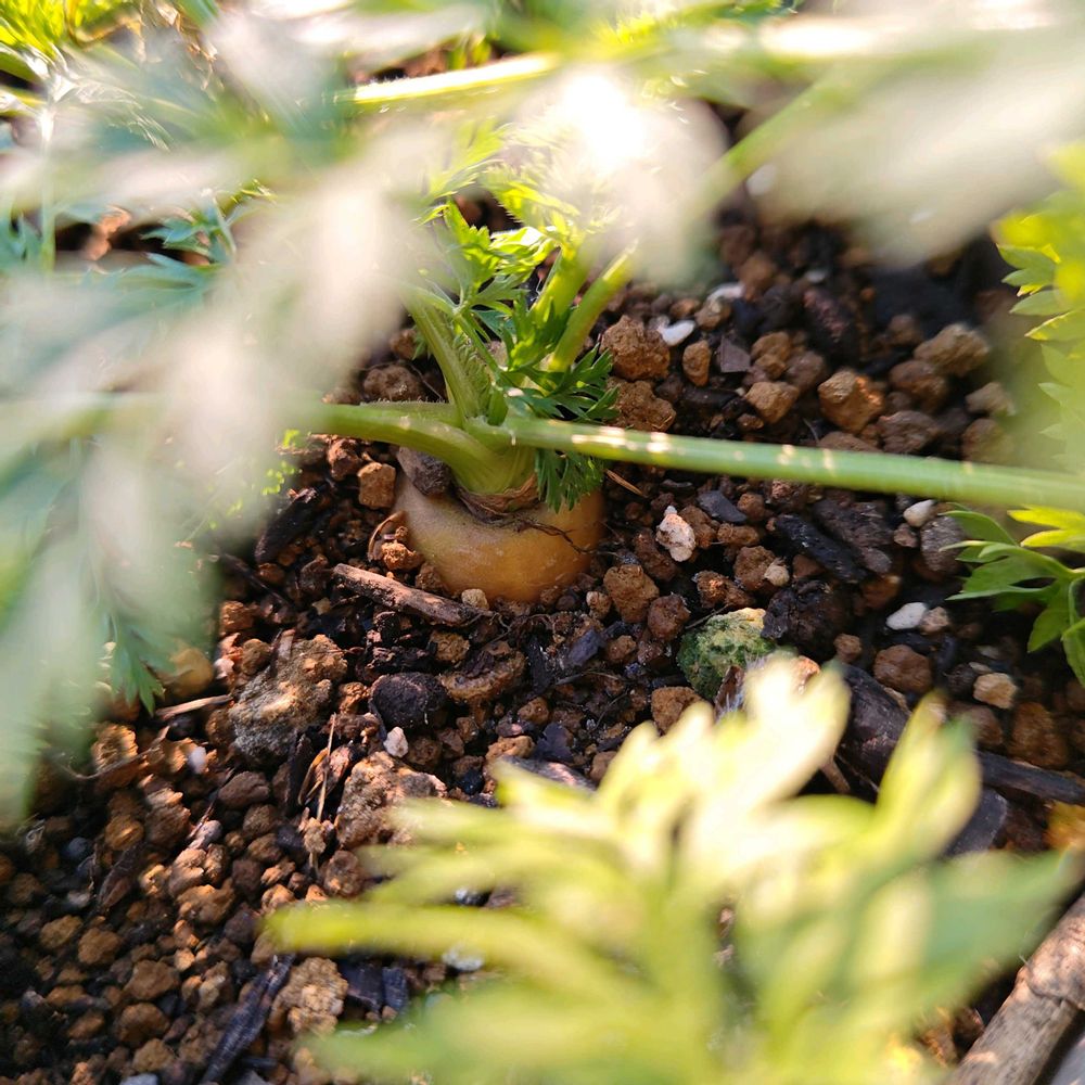 【1枚目】秋まきしたニンジンは直径3センチくらいかな。そろそろ収穫してもいいかしら😚