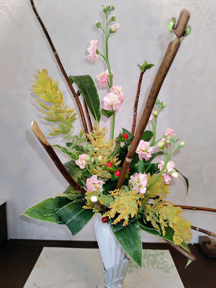ピンク色の🩷ストックとミモザが春を思わせます🎵