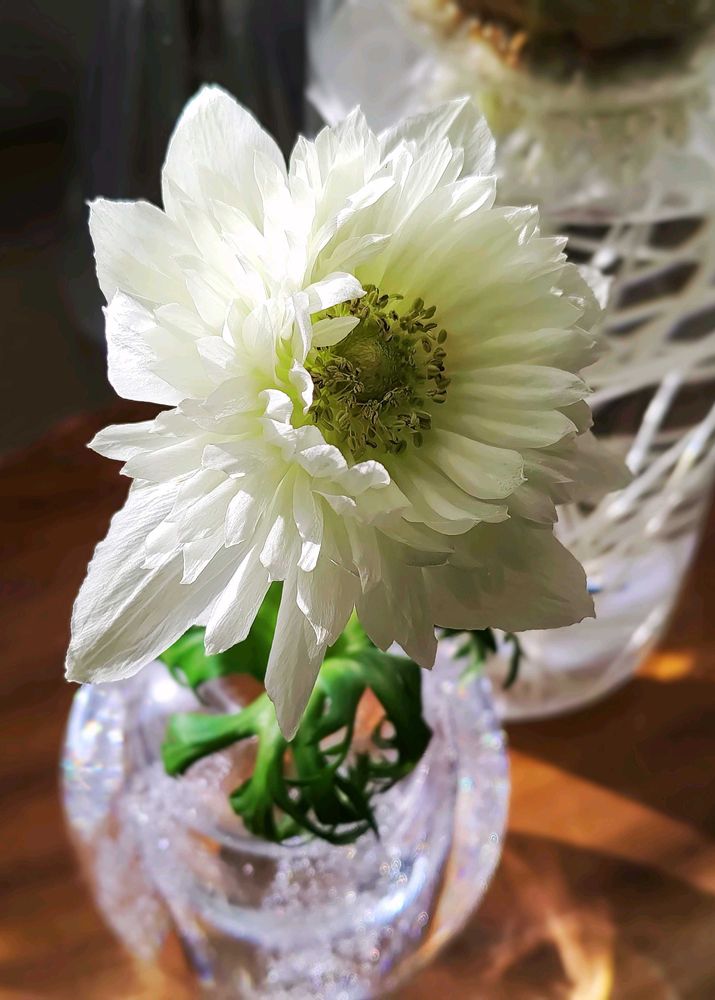 先日の夕暮れのアネモネは小さいながら八重咲きで優美なお顔