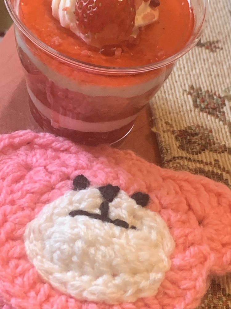 今日も寒くて外に出られませんでした🥶買い物行かずあるもの食べてこもりました🏠ペペロミア見て、いちご🍓スイーツ食べて、クマたわしを編みました🧸苺とクマが好きです☀️明日も寒いそうです🥶皆様ご自愛ください👍