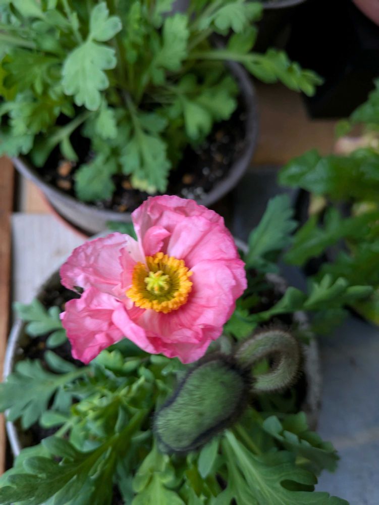 ピンクのアイスランドポピーが、やっと咲きました。寒いから、黄色もまだ咲いています。