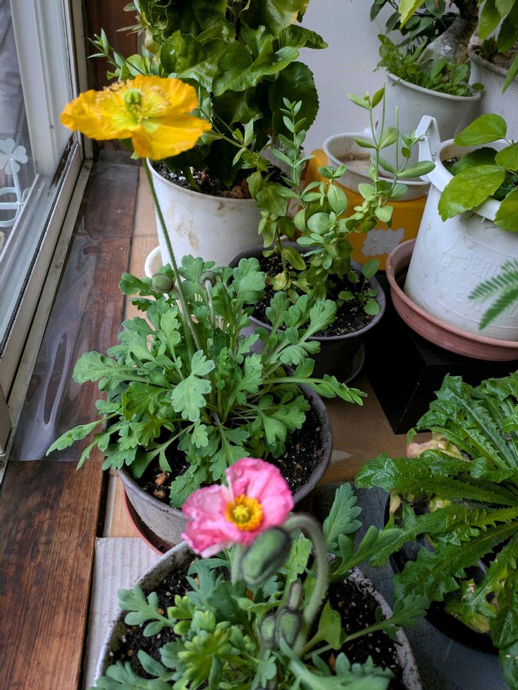 強いシャーレーは外にいるけど、アイスランドポピーは、窓辺でヌクヌクしています。