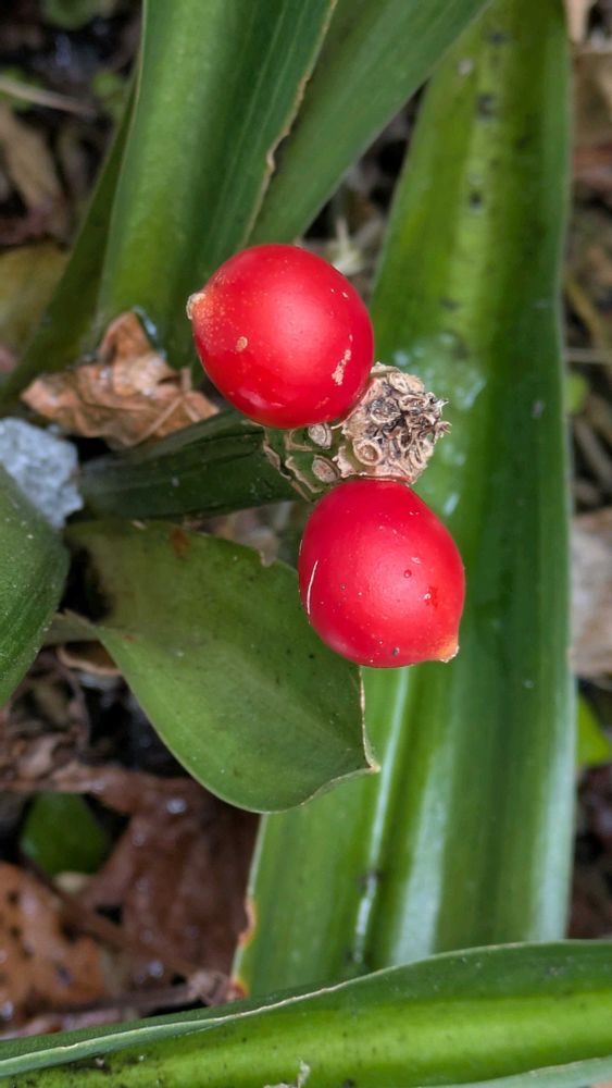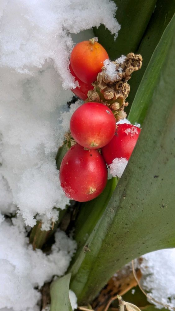 放ったらかしの我が家のオモトたちは、赤い実も少ししか生っていないけれど、雪の中だと少しは鑑賞に耐えるか🔴