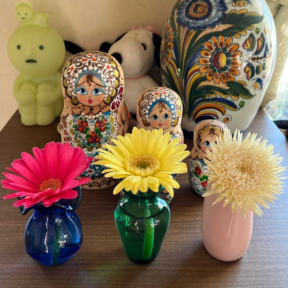 ガーベラも、一輪挿しの花びんも、その後ろのマトリョーシカ🪆もかわいい💕です