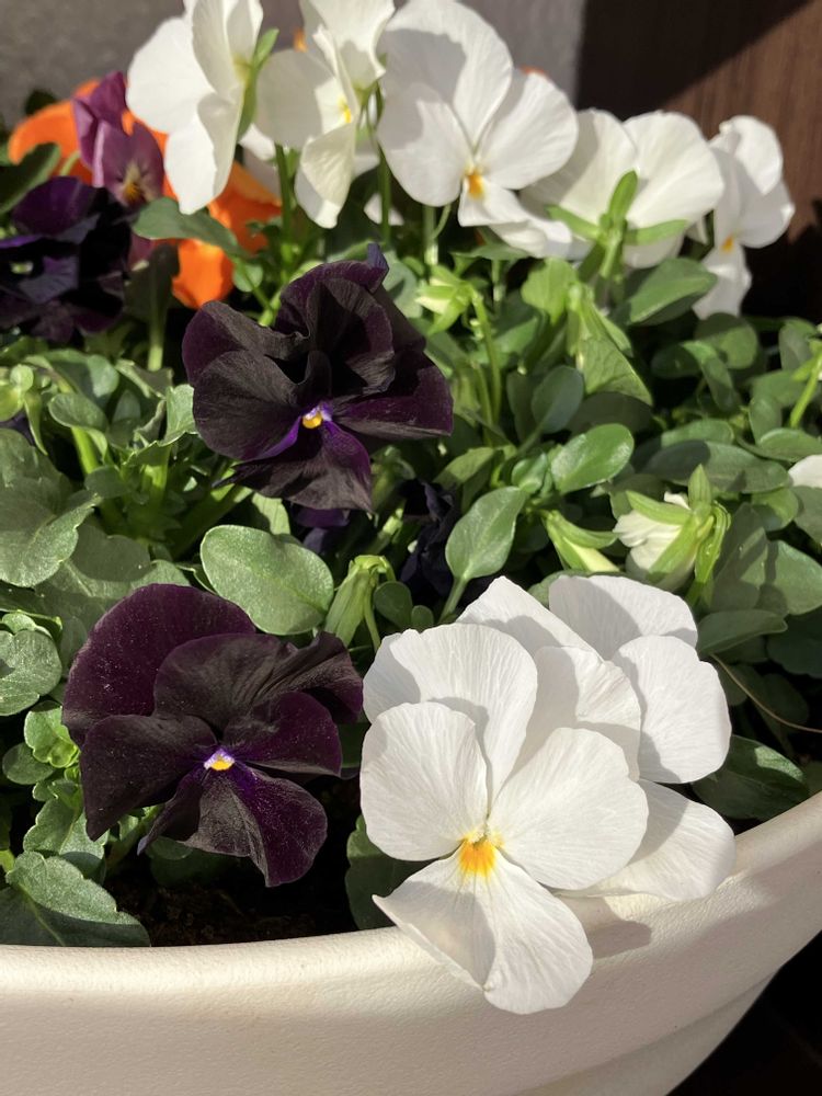 黒🖤、白🤍、オレンジ🧡、薄紫💜の4色で寄せ植えしてみました♪
