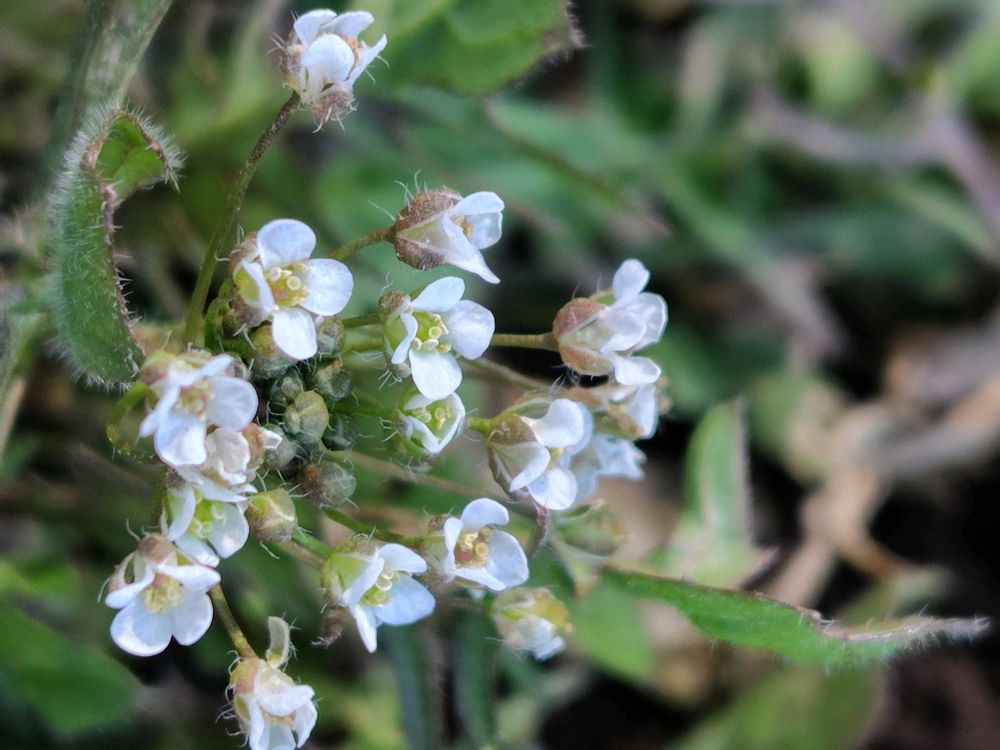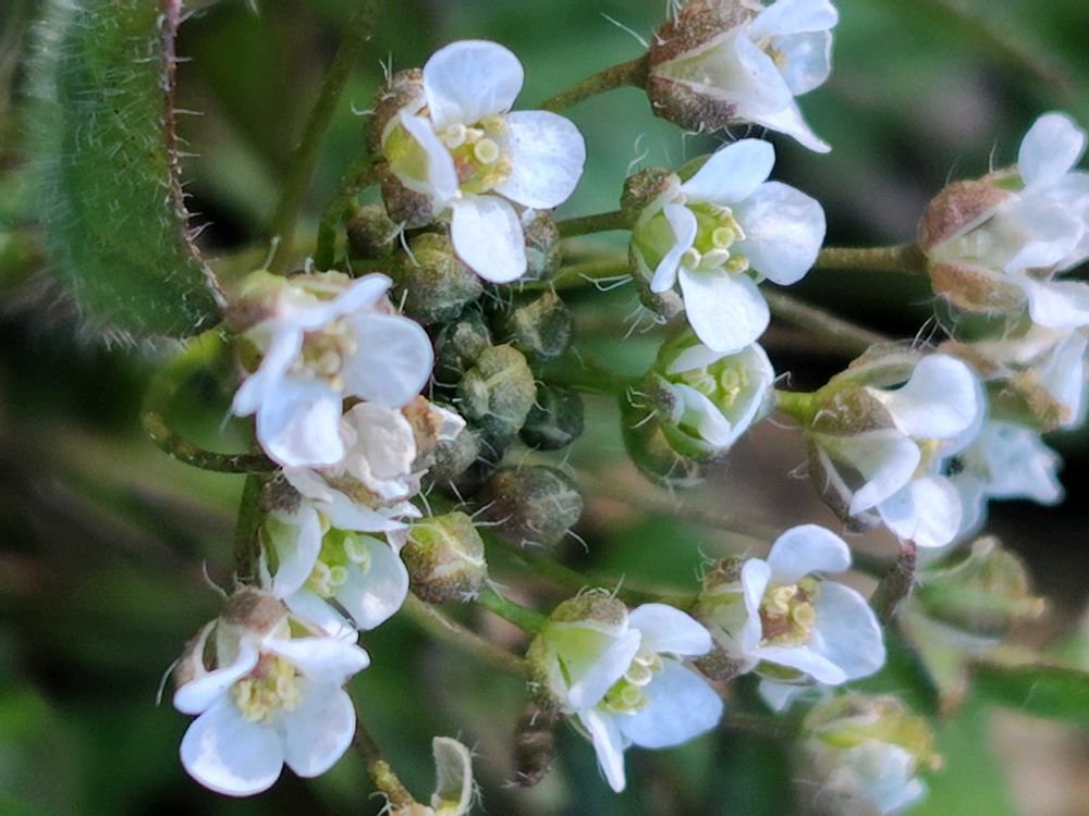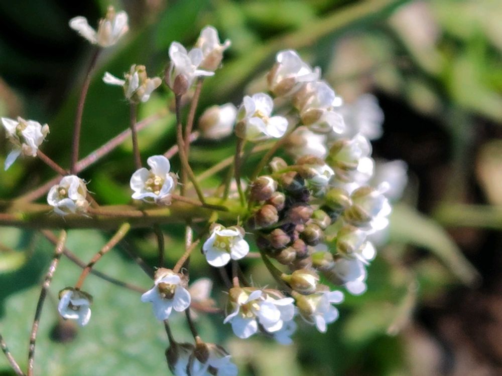 花茎を伸ばして分枝する枝先に、総状花序を出して、十字形で4枚の白い花弁を持つ3mmほどの小さな花を多数付ける。