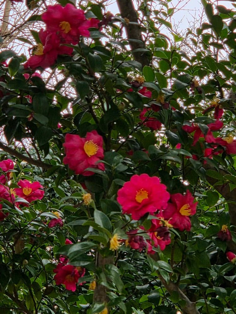 ➀やぶ椿灰色ぽい幹に沢山の花が見事でした。