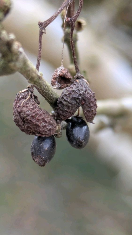 裂開した実からはすっかり黒くなった種が落ちずに残り、ピカピカしている 木曜日は木🏷(✪▽✪)