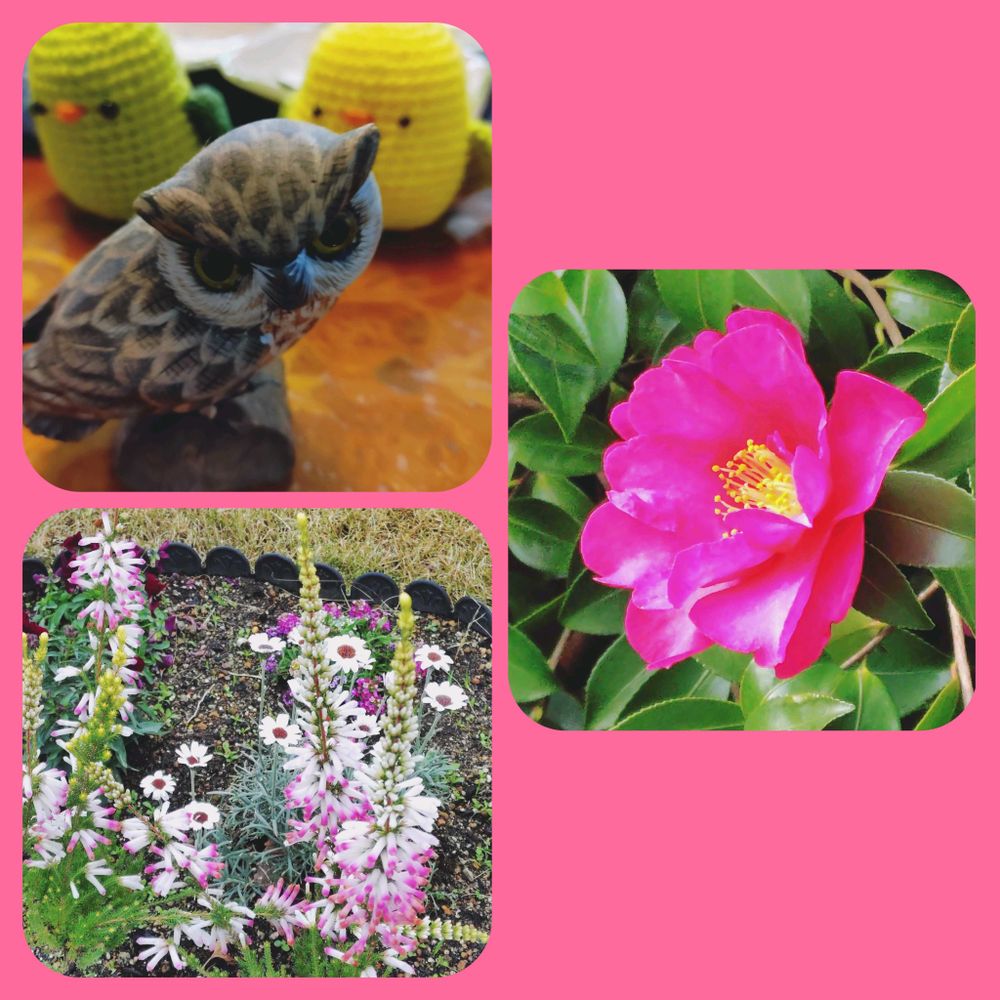 ピンク🩷🩷のサザンカ、エリカ、綺麗に咲いてますねー、👀が力強い🦉さん、素敵ですねー🎶✨✨✨✨