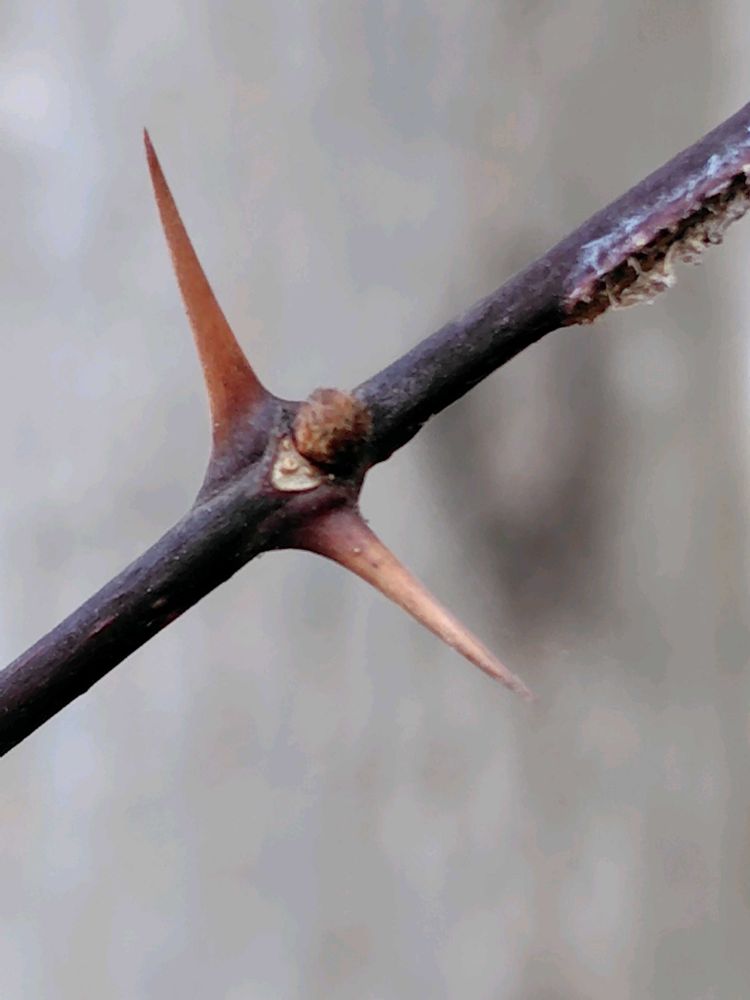 鱗片(芽を包む皮)におおわれた「裸芽」で丸みがあり小さい。節々に対生する鋭いトゲの間に冬芽が見られる。