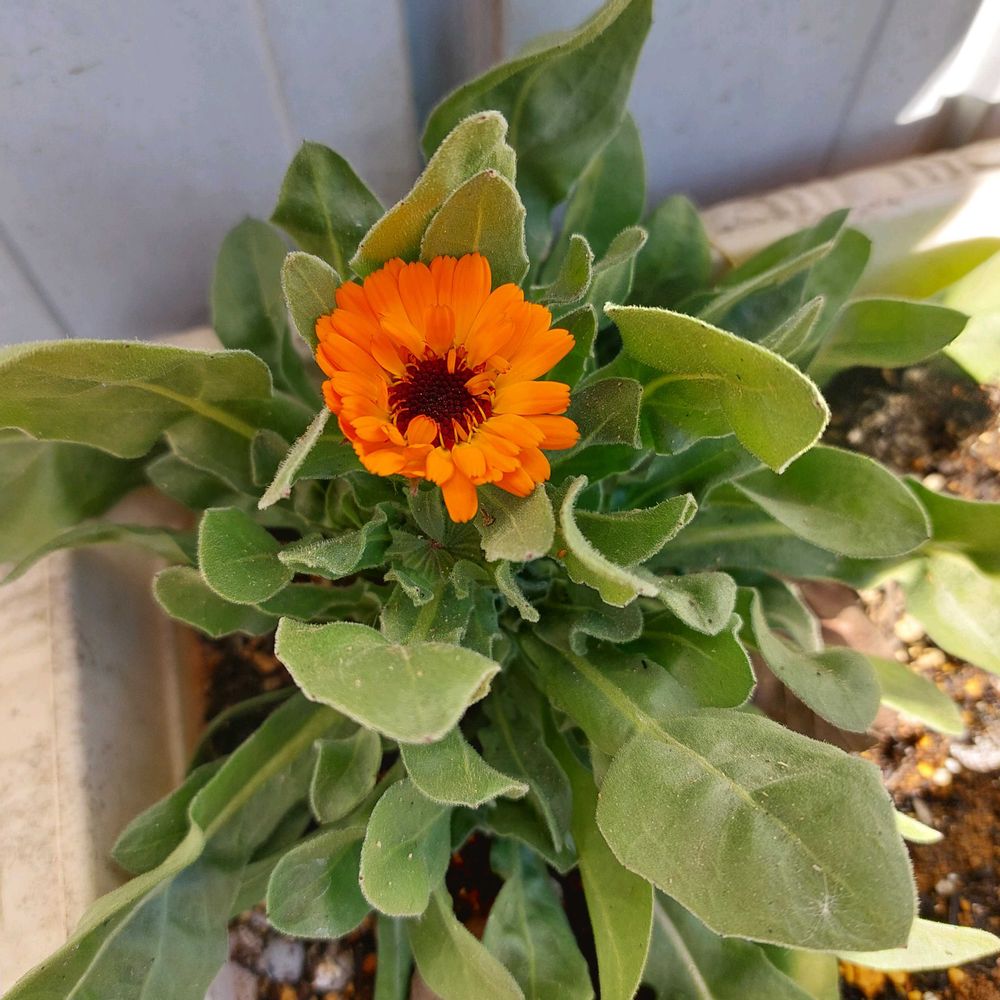 種まきからの、キンセンカ🧡一つ咲きました😄