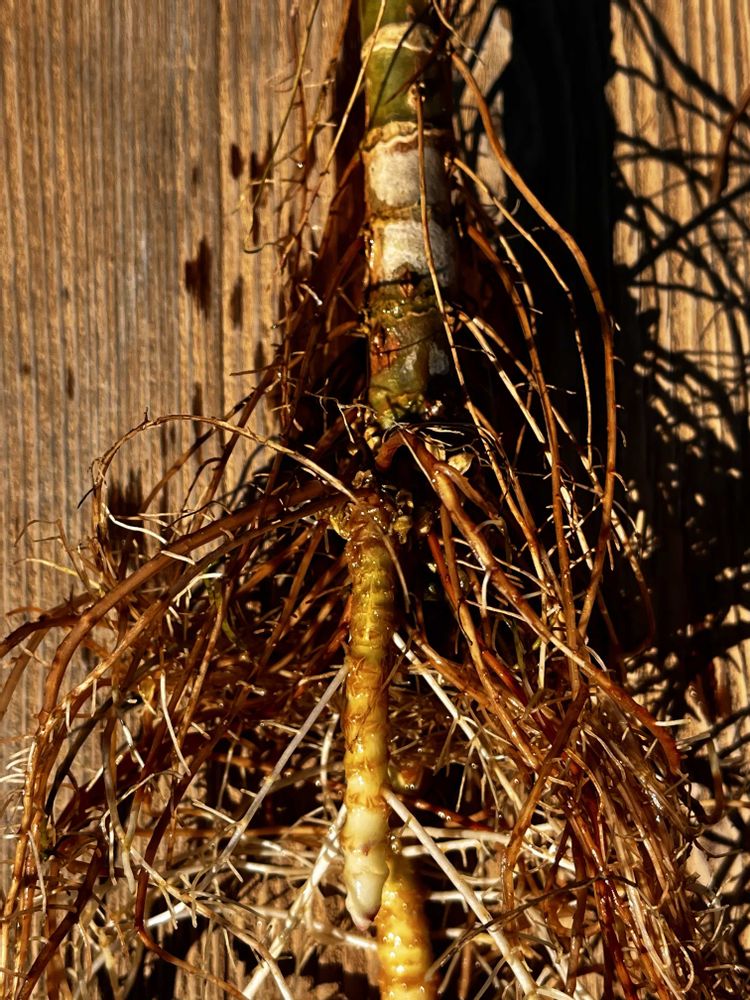 写真の上半分が茎(主幹)、中心から下が根茎になります。