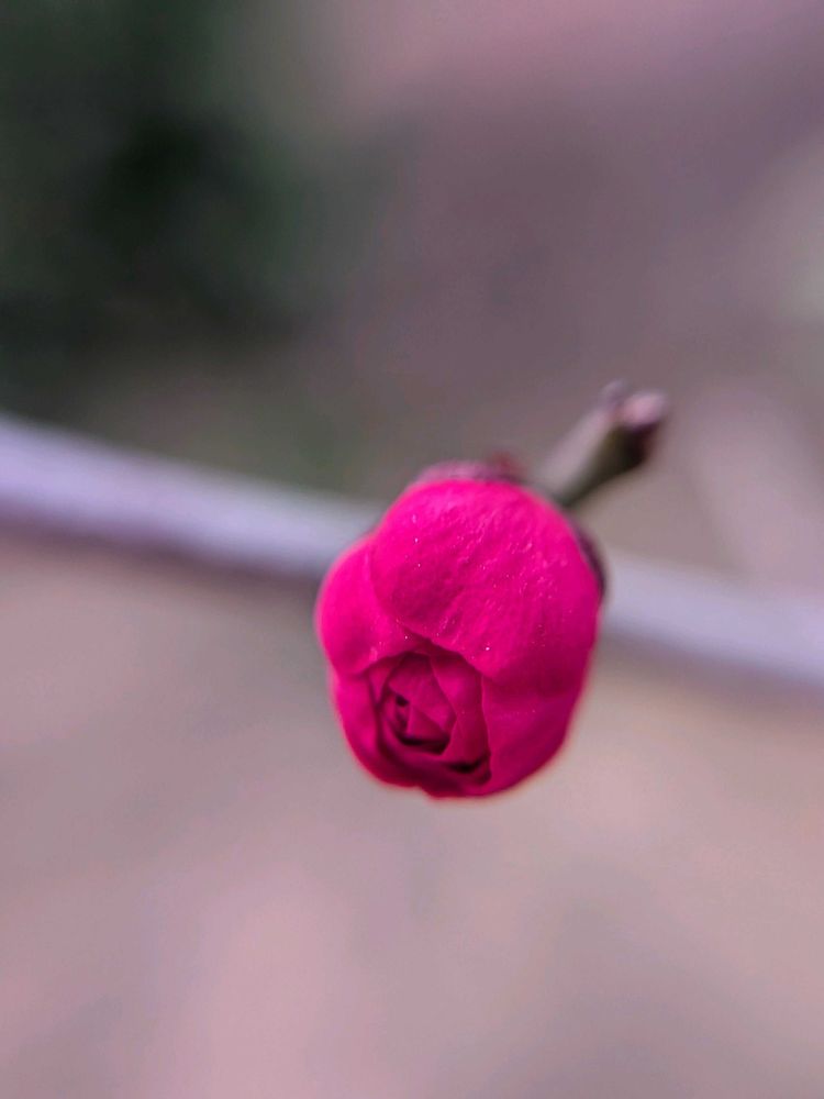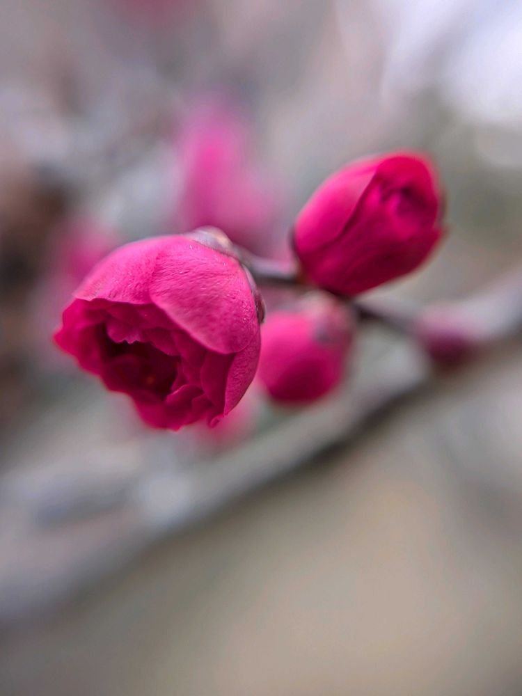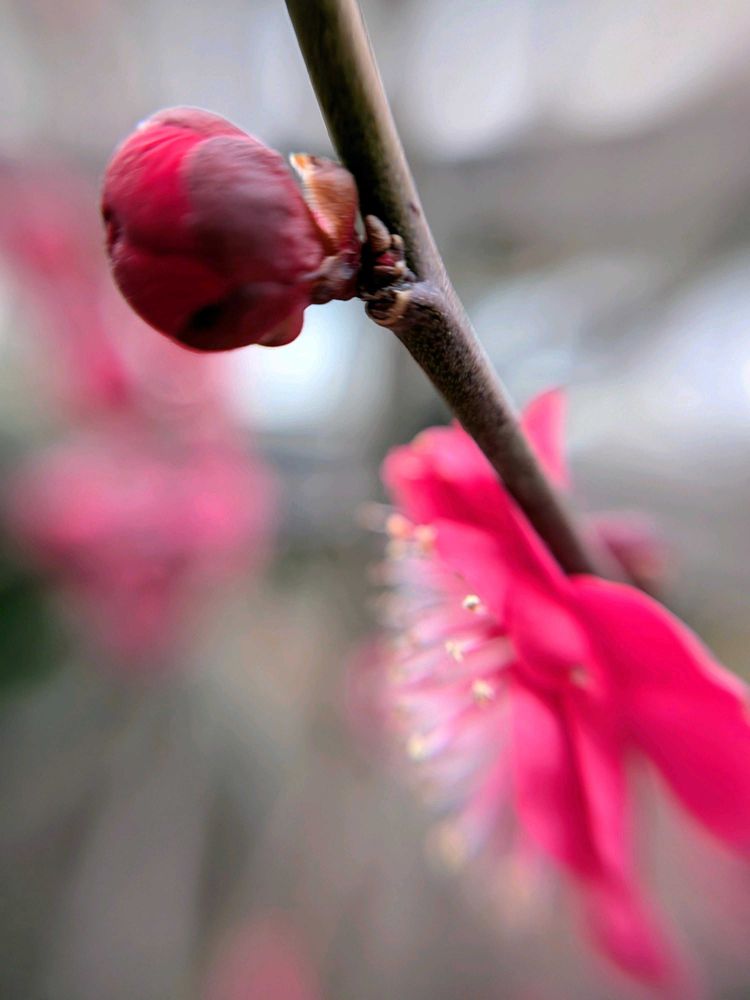 この梅を投稿する時、紅梅と書こうと思ったんだけど、蕾は赤紫で、咲くと濃いピンク色☺