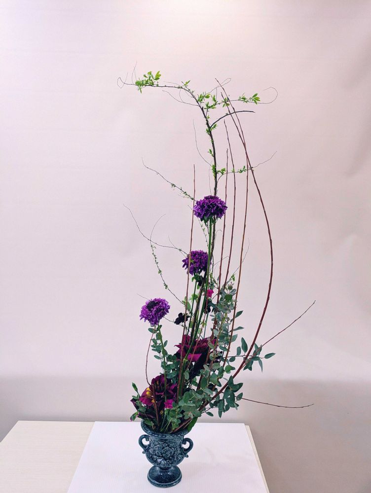 のびのびとした素敵なアレンジですね〜私もサンゴミズキの様な長い枝があったら挑戦してみたいな〜💕長い中にいるスカビオサの色がまた素敵です・・💕