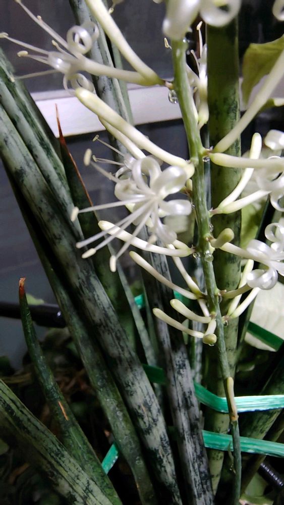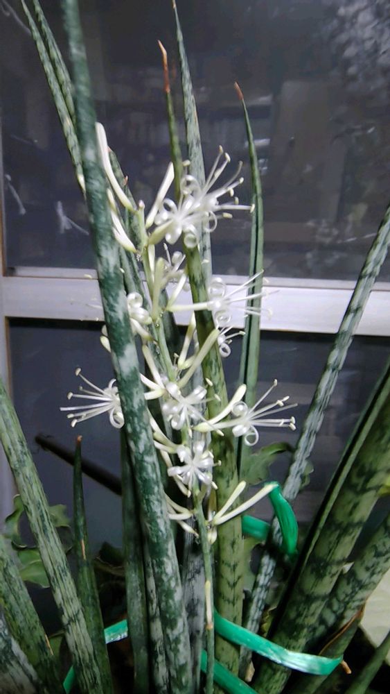 まあ~サンスベリア咲きましたね🥳🥳🥳お目当てとう、花をつけるのが、珍しいようです、6年前に私のところも咲いたんですが、かぶが大きくなり、3個株分けしたら、今はヒヨヒヨになってしまい、後悔しています、とにかくおめでとう💕💕