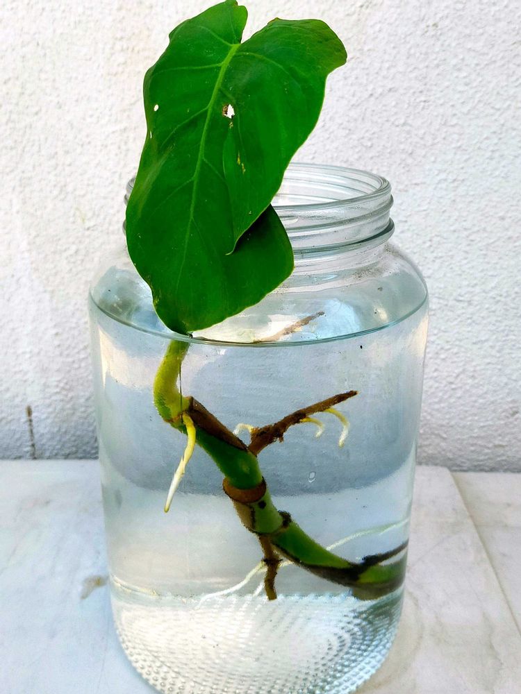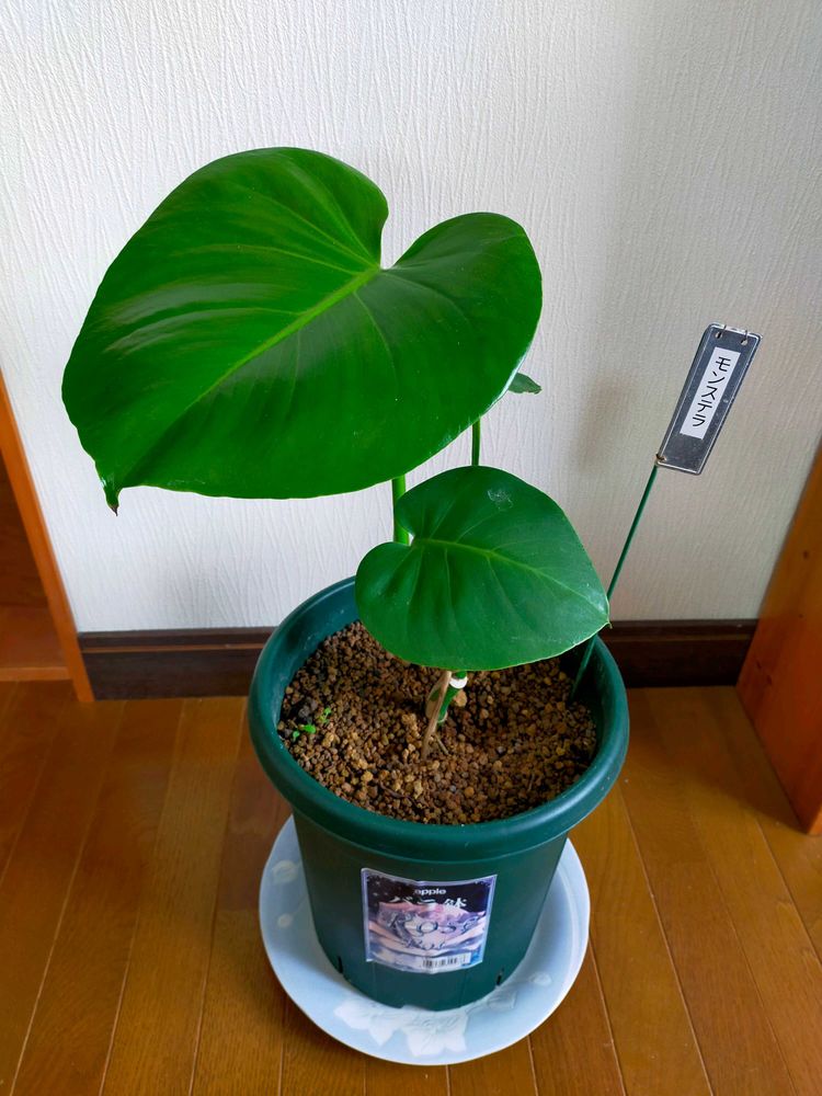 モンステラがここまで育ちました。ほぼ枯れて鉢から落ちた物を水に入れたら根が出たのでしっかりなるまでそのままにしておき鉢に植替え、4枚目の葉は20センチ程です😊