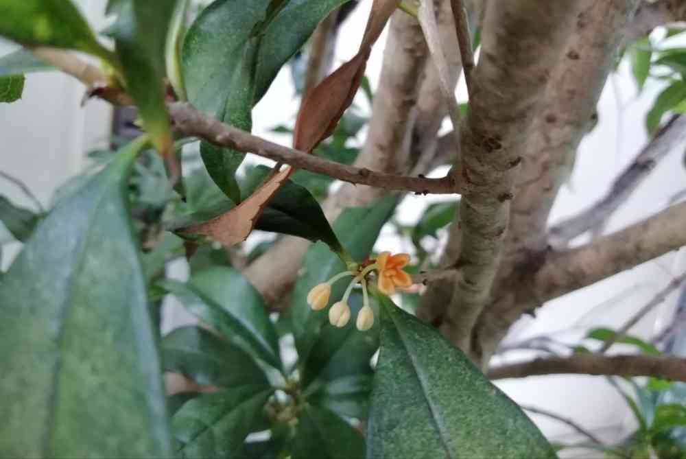 ほんのりオレンジ色にふくらんだ金木犀の花。