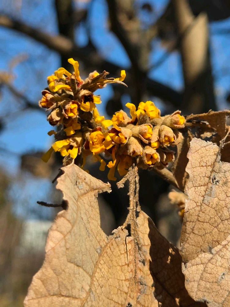 前年の枯れ葉の上に黄色いリボン状の香りの有るお花が咲いてますユニークな花姿……