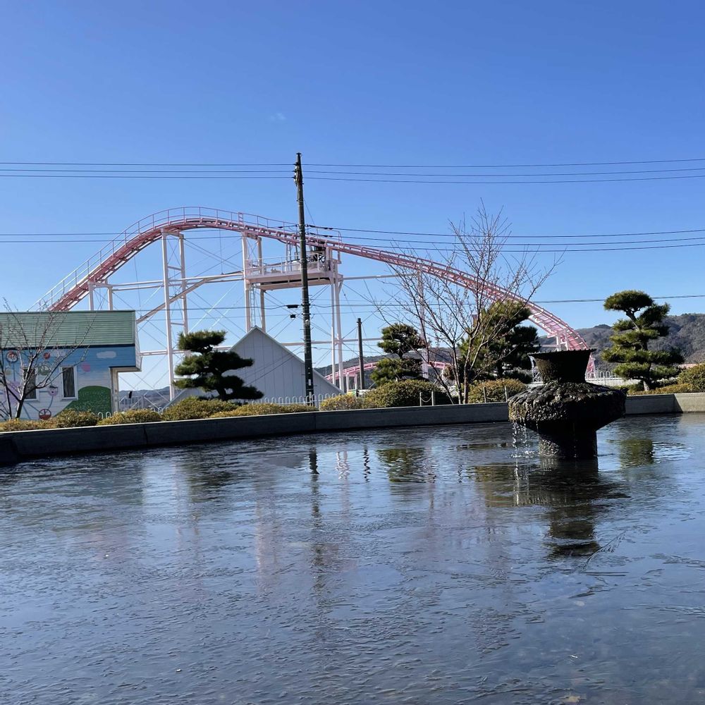 ⑤奥に🌸チラリ〜遊園地🎢〜池の水は薄っすら凍ってました🧊